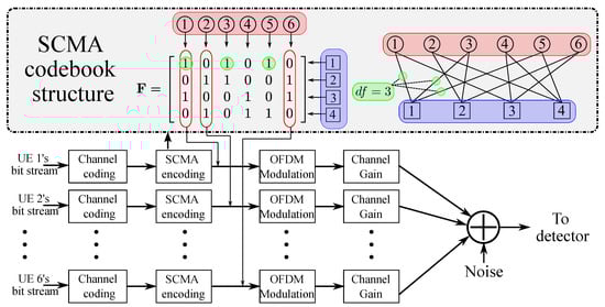 A general SCMA system uses a codebook, expressed by a factor graph matrix of binary elements, . Accordingly, the codebook contains J codewords, and each codeword is a D-dimensional complex vector (called the sparse vector) with nonzero entries. Therefore, the number of codewords becomes , and there are codewords multiplexed per subcarrier of an OFDM. Figure 2 illustrates a system consisting of six active UEs and OFDM subcarriers. By establishing an SCMA layer, each UE is allocated to of subcarriers, as assigned to a codeword via an SCMA encoder. The transmit symbol of each UE is appropriately spread over subcarriers. The sparsity of codewords, i.e., M non-zeros among D entities of a codeword, allows the SCMA decoder at the receiver to recover the messages of all the UEs under controllable interference. The interference is usually handled by a joint decoding based on a message passing algorithm (MPA). The SCMA allows the BS to serve a number of UEs exceeding the number of OFDM subcarriers, which leads to enhanced SE.