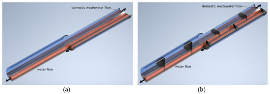 The purpose of the heat exchangers is to recover the energy deposited in the drain water, which is usually irretrievably wasted. Both solutions can be used in existing and newly designed buildings. They are made of a plastic body and a conduit that transports heated water inside. The conduit is made of a material with high thermal conductivity, e.g., copper. In the case of the HE_1 heat exchanger, additional partitions were used to extend the flow path and intensify the turbulent flow of wastewater, as a result of which a significant increase in its efficiency was obtained [40].