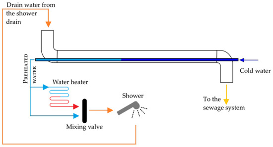 The implementation of the DWHR unit requires modification of the plumbing installation in the building. In the case of shower heat exchangers, the water preheated in the heat exchanger can be fed to the hot water heater, shower mixing valve or both devices simultaneously (instead of cold water). The research [46] shows, however, that the greatest financial benefits can be achieved when the preheated water is supplied both to the shower mixing valve and to the hot water heater. Therefore, such a solution was adopted in the analysis (Figure 2). In this case, flow rates of water and drain water through the heat exchanger are equal.