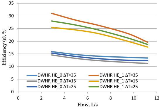The temperature to which the tap water will be preheated thanks to the use of the DWHR unit (Twpi) can be determined on the basis of the efficiency (ε) that the device achieves in given conditions of the installation use. Research on the efficiency (ε) of HE_1 and HE_0 heat exchangers for various parameters of their operation was described by the authors in paper [40]. Based on the results presented in this article, the most favorable parameters of the exchanger’s operation in terms of slope and flow ratio were selected. The dependence of the HE_0 and HE_1 heat exchangers’ efficiency on the water and drain water flow through the device for such working conditions is shown in Figure 3. The graph relates to a 1:1 flow ratio, a 3% heat exchanger slope and three different ΔT (temperature difference between heated water and greywater) values.