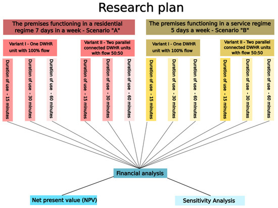 The research plan for financial analysis based on energy efficiency of solutions was tested in the scenarios presented in Figure 4.