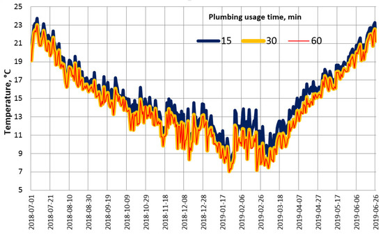 According to the objective of the research, the financial analysis was based on the actual temperature distribution of cold water supplying the draw-off points. In the first stage, water temperature measurements were taken for the draw-off point from which water was supplied to the DWHR units tested. On the basis of the measurement results, the average daily cold water temperatures were determined for three times of the system usage—15, 30 and 60 min, respectively. They are shown in Figure 5.