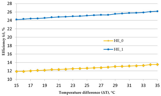 The basis for further considerations were the results of the studies presented in [40], which showed that the efficiency of HE_0 and HE_1 heat exchangers changed with the change in the temperature difference between heated water and grey water (ΔT). This is shown in Figure 6.