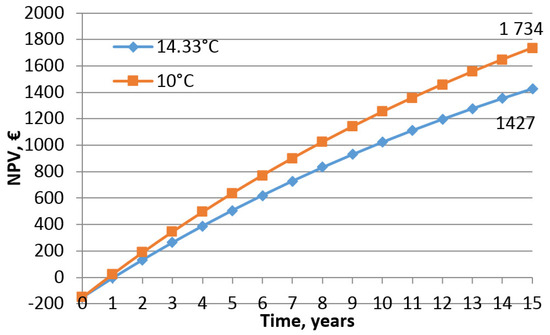 In the case of averaging the daily cold water temperatures, the calculation of the NPV value was possible thanks to summing up the daily energy savings obtained in the consecutive days of the year, according to the Equation (3). The same procedure was followed for the remaining time periods, except that the mean values of the ΔT from the period of the week, month and year were taken consecutively.