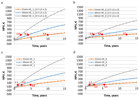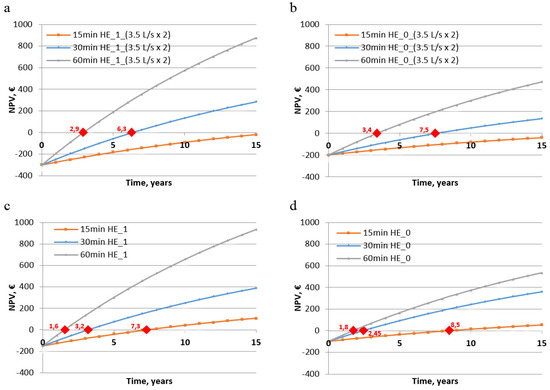 However, it is not profitable to make the investment in every variant examined. The highest NPV, equal to EUR 936, was obtained for Variant I, HE_1 and a shower time of 60 min a day. Not all cases of Variant II in the 15-year cycle are characterized by the positive value of NPV. In the most unfavorable cases, providing for a shower time of 15 min, the NPV for HE_1 was EUR −18, and for HE_0, EUR −40€. For these cases, the payback period is longer than the DWHR system’s lifetime (n = 15 years).