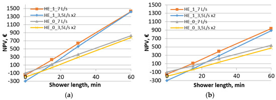 Dependence of NPV on shower length: (a) Scenario A (365 days); (b) Scenario B (261 days).