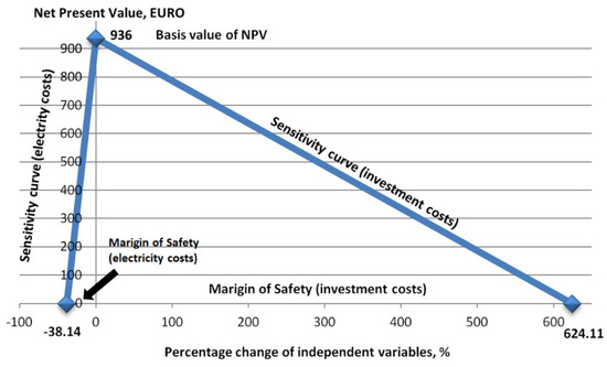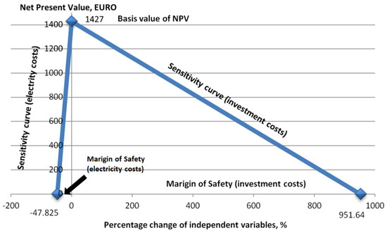 For both scenarios, one financially most favorable case was selected (heat exchanger HE_1 in Variant I and a 60 min daily shower length) and a sensitivity analysis was performed. For this purpose, the NPV values for various levels of percentage changes of independent variables (electricity prices, investment costs) were determined. The results were plotted on the charts presented in Figure 11 and Figure 12, thus obtaining sensitivity curves. Their intersection with the horizontal axis indicates the values of the relative safety margins. These are the permissible deviation of the electricity costs and investment costs from the base values, where the project remains profitable.