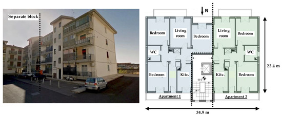 The building chosen as a case study is an apartment block with four storeys located in Catania (Italy), a city with hot and humid climate and sunny days for most of the year. Figure 1 reports a view of the north facade. This residential building has a rectangular shape, and consists of two identical blocks placed side by side; each block has an overall gross floor area of 816 m2 and a net floor area of around 725 m2. The gross height of each storey is 3 m, while the heated gross volume of the entire building is around 2500 m3.