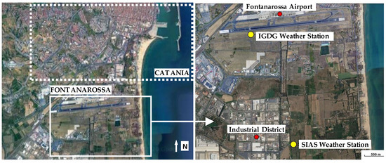 For this reason, the weather data used in this study have been recorded by the rural weather station owned by SIAS (Sicilian Agrometeorological Information System), which is located at the following geographical coordinates: 37°26′31″ N, 15°04′04″ E (altitude 10 m asl). Instead, the data included in the IGDG series refer to the weather station next to Fontanarossa airport (37°27′52″ N, 15°03′30″ E, altitude 17 m asl), which is located just 3 km north of the SIAS station. As shown in Figure 3, both weather stations are placed in a rural area, overlooking the sea on the east side and mainly agricultural fields on the north and the south side. The SIAS station has a light industrial and warehousing district to its west side.