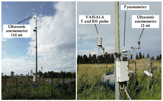 The SIAS weather dataset covers a period of 18 years (2002–2019) and contains hourly values of dry bulb temperature (in °C), relative humidity (in %), global horizontal irradiation (in MJ/m2), wind speed (in m/s), wind direction, and atmospheric pressure (in hPa). The dry bulb temperatures were measured from 2002 to 2009 with a MTX-TAM sensor (accuracy ±0.15 °C), whereas in 2010 a Vaisala HMP45 temperature and humidity probe was installed (accuracy ±0.2 °C and ±1% at 20 °C, respectively). The global horizontal irradiation is measured by a Schenk pyranometer type 8102 (accuracy < 10 W/m2). The wind speed and direction are measured by two Gill Windsonic ultrasonic anemometers (accuracy ±2% and ±2°, respectively) placed at 2 and 10 m above ground, as shown in Figure 4.