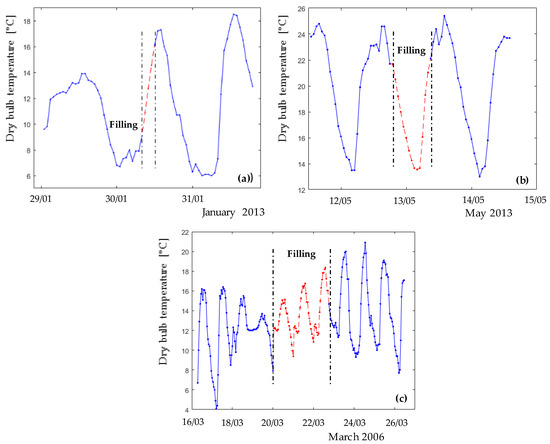 Examples of the filling procedure. (a) 0–6 h gaps. (b) 6–24 h gaps, (c) 24–72 h gaps (the dotted lines correspond to the data added through the filling procedure).