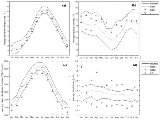 As far as the CTI data are concerned, these are generally quite close to the mean SIAS values: Indeed, they derive from a recent (although shorter) recording period and also from the same weather station. The only relevant difference concerns the wind speed (Figure 6d): However, it is important to observe that the wind data included in the CTI weather file refer to a height of 2 m above ground, while all other wind data have been measured at 10 m above ground. This is in the authors’ opinion a serious flaw in the CTI dataset, which implies the need to perform arbitrary conversions through suitable equations in order to make comparisons—and simulations—possible.