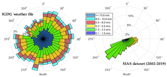 Finally, the mean wind speed measured by the SIAS weather station is significantly below the values proposed in the IGDG typical year, especially in January and April, despite the fact that the distance between the two weather stations amounts to just a few kilometers (Figure 6d). This difference could originate from a variation in the local wind pattern in the last fifty years, but it is much more likely that the wind speed measured by the SIAS station is affected by the proximity of an industrial district with low-rise warehouses at a distance of approximately 300 m, which can be observed in Figure 3.