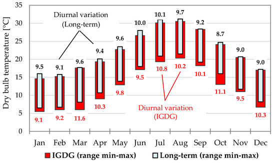Starting from the dry bulb air temperature (Figure 6a), for each calendar month the mean monthly values referring to the 18 years included in the SIAS dataset can vary within a range whose amplitude is around 3 °C. The IGDG series reports systematically lower mean values, which in some cases fall below the range of variation for the SIAS dataset. This means that a slight increase in the mean air temperature has been observed in the 30 years elapsed from the recording of the IGDG data to the recording of the SIAS weather station. As an example, in July the average of the IGDG series is 24.8 °C, but it rises to 26.1 °C in the SIAS weather dataset. Coherently, a non-negligible overestimation in the mean relative humidity emerges when using the IGDG dataset, especially in the summer months, amounting to around 5% or 10% (Figure 6b).