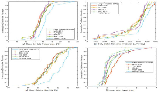 - Construction of the Cumulative Distribution Functions (CDFs) for the selected weather parameters. For every calendar month, the daily values of the selected weather parameters are sorted in ascending order and then used for creating monthly CDFs referred both to the whole period of record (long-term) and to each single year (short-term). CDFs are built according to Equation (1) in the TMY approach, or Equation (2) if the ISO 15927-4 Standard is adopted:In the above equations, x is the weather parameter, n is the total number of daily observations for that parameter, k is the order number for each x-value within that calendar month (short-term) or within the whole dataset (long-term). No explicit reference to the previous equations is made in the IWEC method. In this paper, the approach indicated in Equation (1) is followed in the construction of the IWEC typical year.