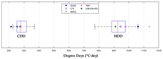 Before commenting on the differences in the predicted energy needs generated by the different weather datasets, it is worth highlighting a significant methodological difference in the estimation of the solar irradiance components. In fact, while the weather files developed in this research rely on hourly measured values for GHI—split into their diffuse and direct normal components as per the Boland and Ridley model [64]—the IGDG dataset reports hourly derived solar irradiance components obtained through the application of the Erbs’ and the modified Liu-Jordan models to daily (not hourly) integral GHI measurements [11]. Along with the different observation period, this aspect contributes to the big variations reported in Table 8.