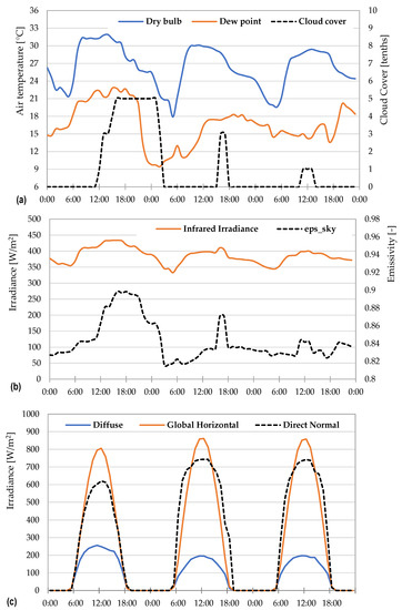 As an example of the preparation process needed to organize the weather data in the .epw format. Figure 11 reports—for three consecutive days extracted from the TMY typical year—the trend of dry bulb air temperature, dew point temperature, and Cloud Cover (panel a), with the related sky emissivity and infrared sky irradiance (panel b). When looking at these graphs, it emerges that the sky emissivity is highly influenced by the dew point temperature and the cloud cover, with a peak value of around 0.9 for TDP = 23 °C and a cloud cover of five tenths. However, sky emissivity values range between 0.82 and 0.90 during the selected days: This affects the infrared irradiance, whose fluctuations between a minimum of about 340 W/m2 and a maximum of around 440 W/m2 mostly depend on the dry bulb air temperature swinging between 18 and 32 °C.