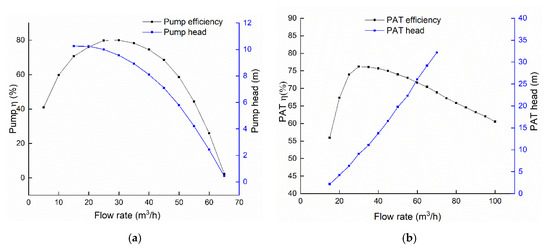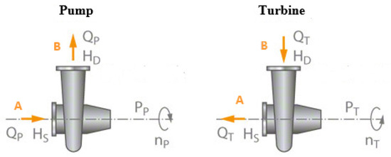 where Ht (m) is the pressure head in turbine mode, Hp (m) is the pressure head in pump mode, ηt is the efficiency of the turbine mode, ηp is the efficiency of the pump mode, Qt (m3h−1) is the design flow rate of the turbine mode, Qp (m3h−1) is the design flow rate of the pump mode, Pp (W) is the power of the pump mode and Pt (W) is the power of the turbine mode.