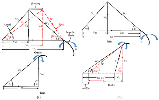 By applying basic trigonometrical principles to Euler’s equation for turbomachinery and velocity triangles, the theoretical head for both pump and turbine modes can be expressed as Equations (3) and (4) respectively:
