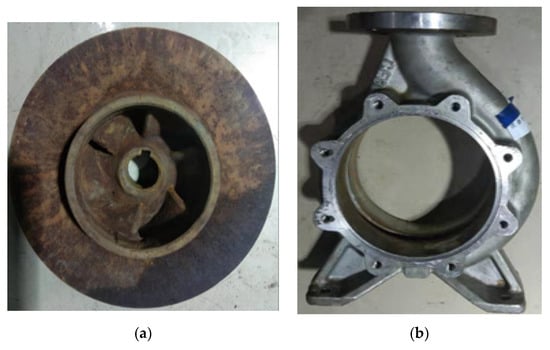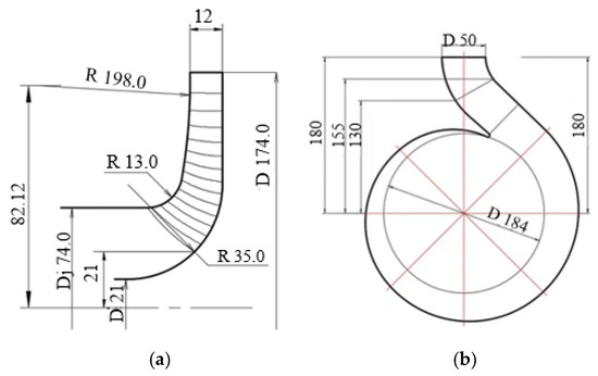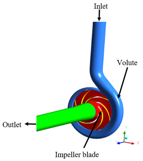 A centrifugal pump was employed as turbine in this study. The pump consists of six straight impeller blades and a spiral volute with a rectangular section. The pump design flowrate Q in pump mode is 25 m3/h, and head is 8.5 m, with a rotating speed of 1450 r/min. The operational conditions of the pump mode is applied in the PAT mode. This pump operating as PAT is mainly composed of impeller with inlet and outlet diameter of 74 mm and 174 mm, respectively, and outlet width of 12 mm, with exit angles of 30°on the hub and shroud. The volute base diameter is 184 mm with inlet width of 20 mm. A summary of design parameters of the selected PAT model under study is listed in Table 1 and Figure 3 shows a sectional view of the pump impeller and volute in 2D while Figure 4 shows the actual pump structure.