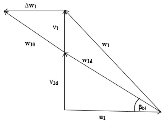 The value of Δw1 can be obtained by applying the triangle similarity theory with the velocity triangle in Figure 5, where the absolute velocity v1 is proportional to the flow rate as expressed in Equation (9):