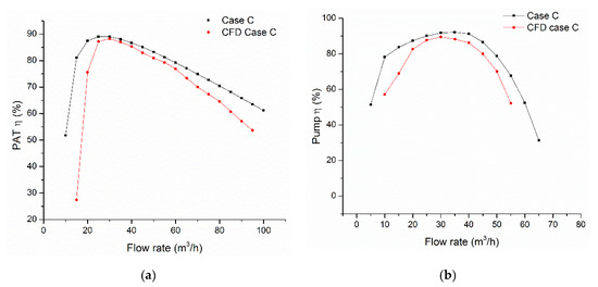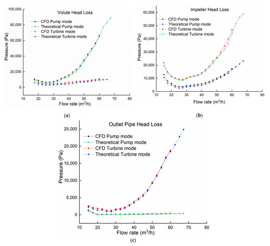 The geometrical parameters of the pump do not change when it works as turbine, only the flow and rotation direction changes. In addition, with the same rotational speed the mechanical losses, power losses due to leakage in turbine and pump modes are the same as stated by Derakshan et al. [34]. The PAT behavior is very complex and it is difficult to find a unique correlation for all pumps in reverse mode [34]. Furthermore, several expressions have to be solved to compute the hydraulic losses in the volute, impeller and outlet pipe. Therefore, since computing of hydraulic losses in PAT mode is somehow complex, these losses were estimated using pump mode.