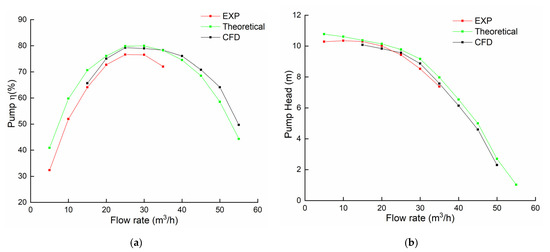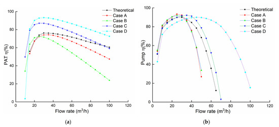 The losses in the inlet and outlet pipe, impeller, and volute have been modeled, and the total hydraulic loss and efficiency for both pump and PAT can be determined by adding up all the losses above. The total head loss, the actual pump head and pump efficiency have been expressed in Equations (45)–(47):