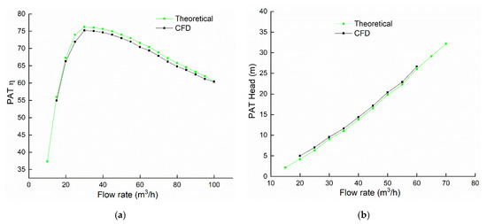 Sharma [23] put forward Equation (9) to predict the PAT mode design flow rate and head: