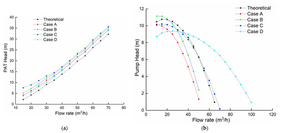 where finc denotes the coefficient of the incidence loss with a value between of 0.5–0.8, w (ms−1) is the relative velocity of the flow, g (ms−2) is the gravitational acceleration and Δhinc is the incidence head loss (m) [35]. This effect is noticeable in both pump and PAT modes.