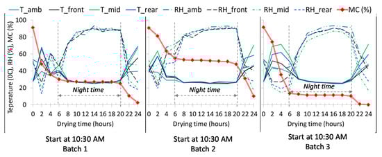 | Relative humidity (RH) | % | Using data logger (EasyLog); the sensors were placed in ambient air and at 3 positions inside the SBD) |