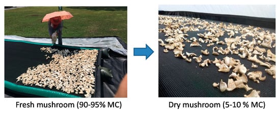 - Bala, B.K.; Morshed, M.A.; Rahman, M.F. Solar Drying of Mushroom Using Solar Tunnel Dryer. 2009. Available online: https://pdfs.semanticscholar.org/073e/fb15fe273f05cd1b70f97f75839856a158a3.pdf?_ga=2.68302035.3719813.1589409163-4187258.1589409163 (accessed on 11 June 2020).