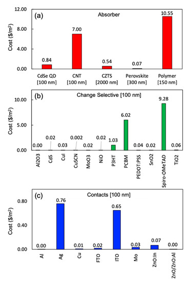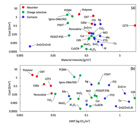 Low-cost and eco-efficient materials for emerging PVs are shown in Figure 4a,b. Figure 4a shows that the choice of ZnO:ZnO:Al is the most ideal from the perpective of cost and material intensity. This material ranks the lowest at both metrics among charge selective layers. It is also shown that the polymer and CNT absorbers and spiro-OMeTAD, and PCBM charge selective materials have the highest cost per unit mass of material used; thus, these materials are not suitable for low-cost energy productions from photovoltaic systems with their current cost. Among all the materials assessed, we found perovskite and ZnO/ZnO:Al as the lowest-cost absorber and contacting materials. The cost of the charge selective materials CuSCN and Al2O3 were found to be very similar to each other and the orders of magnitude were lower compared to other contacting materials such as P3HT, spiro-OMeTAD and PCBM. Other charge selective layers, such as CdS, CuI, SnO2, were ranked intermediate in cost, while all inorganic options for the charge selective layers showed similar material intensity.