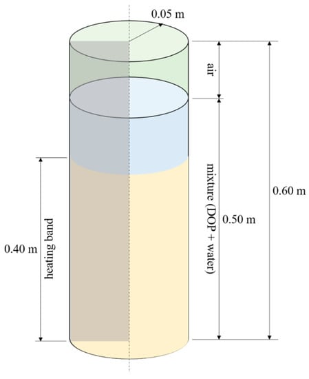 According to the experiments, the HTC slurry composed of DOP and water is set to have a biomass to water ratio of 1:6 and to be homogeneous at the beginning of the process. Therefore, we set a uniform distribution of the dispersed phase as initial condition in the simulation. The air is placed on the top of the batch reactor (Figure 1). As far as the boundary conditions is concerned, we impose a constant heat flux, which value depends on the power input selected, in the heater band region, while adiabatic condition is set elsewhere along the lateral surface of the reactor. On the top and bottom of the reactor instead, we set a convection boundary condition, that is a heat transfer with the external environment, by assuming that this is constituted by stationary air at 27 °C and characterized by a heat transfer coefficient of 20 W/m2K. Such a boundary condition has been set to consider the heat losses from the reactor. Either the DOP/water mixture and the air are set at rest at the beginning of each simulation, with uniform temperature of 27 °C and atmospheric pressure.