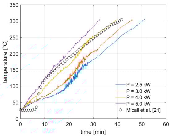 In this study, four cases are analyzed, that are: 5.0 kW, 4.0 kW, 3.0 kW and 2.5 kW as thermal power input. In Figure 2, we show the temperature trends as obtained by the numerical simulations, for all the cases, during the initial transient state of the process, that is the heating stage, in comparison with the experimental measurements provide in [21].