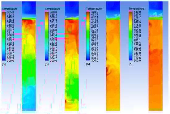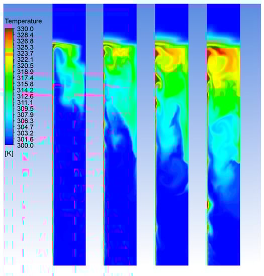 Temperature field in the batch reactor, for the case of power input of 4.0 kW. From left to the right: 20, 40, 60 and 80 s after the start of the process.