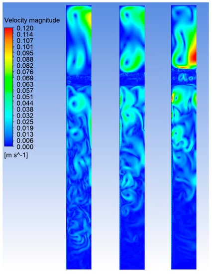 Velocity fields within the reactor at different times, for the case of power input of 4.0 kW. From left to the right: 10, 20 and 30 min after the start of the process.