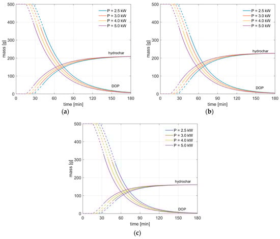 In Figure 7, dashed lines indicate the initial transient phase of the HTC process, which is characterized by an increasing of the temperature and, in turn, of the reaction rate; the continuous lines of Figure 7 represent instead the HTC process at constant operating temperature. The results show that in all cases the hydrochar mass increases considerably during the first hour of the process, to reach then its asymptotic value. The obtained trends are consistent: when the power input is increased, the reaction mechanisms occur earlier, thus the DOP mass is more rapidly converted to hydrochar. Also, we note that no discontinuities are observable in the mass evolution trends between transient and steady states of the process. This indicates that the provided kinetic model is suitable to describe the initial transient stage of the HTC process, which is crucial to accurately determine the overall required time. This is reported in Figure 8, for all of the considered cases.