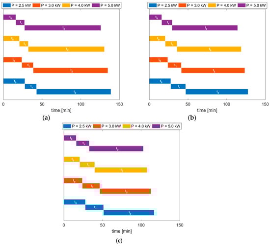 Required time for the HTC process to produce the 95% of the target hydrochar mass (i.e. . (a): ; (b): ; (c): . For each power input case, the process time is subdivided into three stages: initial no-reaction phase , heating-up phase with increasing reaction rate , and reaction phase at constant operating temperature .