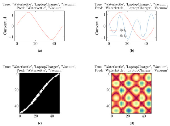 Figure 9 presents the predicted multiple appliances from the CNN based classifier with different feature representation. We see that compared to the activation current in Figure 9a and the V-I image Figure 9c, the proposed Fryze’s current-decomposition in Figure 9b,d is capable of detecting all multiple running appliances. This shows that the Fryze current decomposition-based feature alone is sufficient for the identification of multiple running appliances.