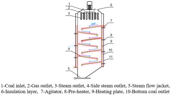 The iron and steel industry is a pillar in the Chinese economy. It provides basic raw materials for national economic and industrial construction, but it also consumes a large amount of coal []. In 2016, the Chinese iron and steel industry consumed 618 million tons of coal, accounting for 16% of the total coal consumption. Metallurgical coke consumed in the iron and steel industry needs to be obtained through high-temperature carbonization with high-quality coke blending []. However, the high moisture content of coking coal (9–12%) leads to high energy consumption and low efficiency of the coking plant. Therefore, setting a pre-drying process before coking could efficiently lower the energy consumption, improve the quality of the coke, increase the blending ratio of non- or weak-caking coal, reduce the production of greenhouse gases and harmful gases, as well as reduce the impact on the water environment [,,,].