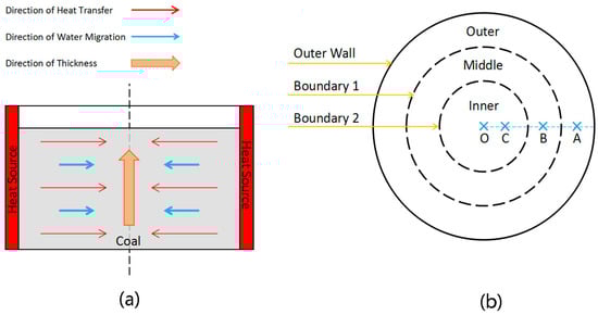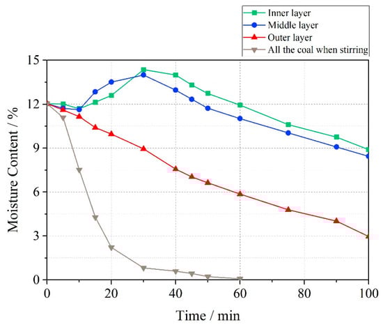 - The coal skeleton and pores in the outside area contained water as a porous medium [], and the moisture absorbed heat and evaporated into water vapor, which diffused through the pores to the interparticle space which caused temperature difference according to the Soret Laws [,]. Since there was no temperature difference in the longitudinal direction, the water vapor generated by the bottom coal did not have the driving force to overcome the transmission resistance to the upper layer. Therefore, except for little evaporation of the upper layer, mostly water vapor could only migrate horizontally to the center of the circular tank. After entering the middle area through the pores, due to the lower coal temperature inside, the steam condensed on the middle coal to become water again [,], and the heat released by the condensation also brought part of the heat capacity to the middle area. At this point, the water content of coal in the middle area did not decrease, but increased. As is shown in Figure 8, the moisture content of the coal in the inner layer experienced a slight increase from 12.03% to 14.36% within 30 min and the moisture content of the coal in the middle layer also experienced a slight increase from 12.03% to 13.99% in the same period, which indicates that there was a repeated evaporation-diffusion-condensation process causing the increasing moisture content of the coal in the certain area.