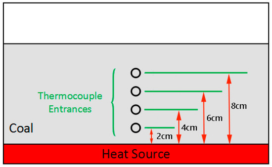 In the sidewall heat transfer experiment, the direction of moisture migration is from the outside to the inside, which is the same as the heat transfer direction and perpendicular to the thickness direction. To analyze the influence of the coal thickness in the heat transfer direction on the law of moisture migration, an indirect thin-layer plane heat transfer experiment was designed. The indirect thin-layer plane drying experiment was designed, as shown in Figure 3. Wet coal (wt 12% water content) was placed in the acrylic cubic device, laying on a preheated electric heating plate (140 °C, 150 °C and 160 °C), till the thickness reached 8 cm, 4 cm, and 2 cm, respectively. The thermocouples were inserted into the coal in a parallel direction to the heating plate, and the insertion depth was half of the width of the device. For the coal thickness of 8 cm, four thermocouples were installed at 2 cm, 4 cm, 6 cm, and 8 cm (surface layer) from the bottom heat source, respectively. By analogy, two thermocouples were installed for the coal thickness of 4 cm, 2 cm, 4 cm (surface layer) from the bottom plate heat source, respectively. For the 2 cm thick coal, only the temperature of 2 cm (surface layer) from the bottom heat source was measured. When the thermocouple was inserted, the temperature values were recorded every 2 s. Samples were taken from the front stratified sampling port every 5 min. The sampling height was the same as the thermocouple insertion height. At each moment, three samples from each layer were taken as parallel.