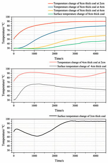 In the indirect thin-layer plane drying experiment, the direction of thermal diffusion and wet diffusion was the same from beginning to end. Coking coal with a thickness of 8 cm, 4 cm, and 2 cm was selected for drying, and the temperature change of each layer in the drying time of 4500 s was shown in Figure 4.