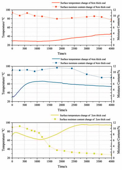 By observing the surface temperature change of 2 cm thick coal and 4 cm thick coal, the peak values were 66.19 °C and 77.68 °C, respectively, and then the temperature decreased with the slight decrease of moisture content. However, the water content of the surface coal of 4 cm thickness decreased to 8% after drying 4000 s, for the thickness of 2 cm, only 1200 s is needed to reach the same surface moisture content. Moreover, it could be easily calculated that the drying rate increased about 3.3 times by decreasing the coal thickness from 4 cm to 2 cm.