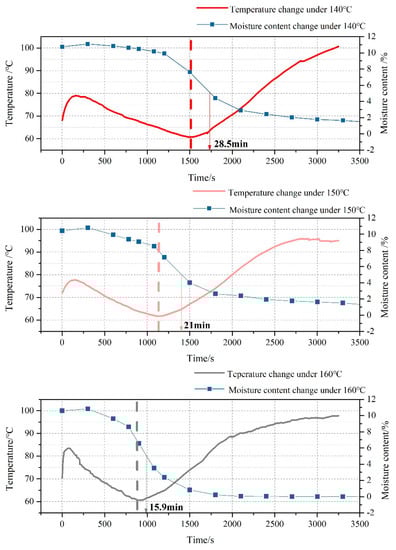 The drying of 2cm thick coal under the heat source temperature maintained at 140 °C,150 °C and 160 °C, respectively, was studied in the thin-layer plane drying experiment. Figure 6 shows the surface temperature and moisture content of the coal under 140 °C, 150 °C, and 160 °C.