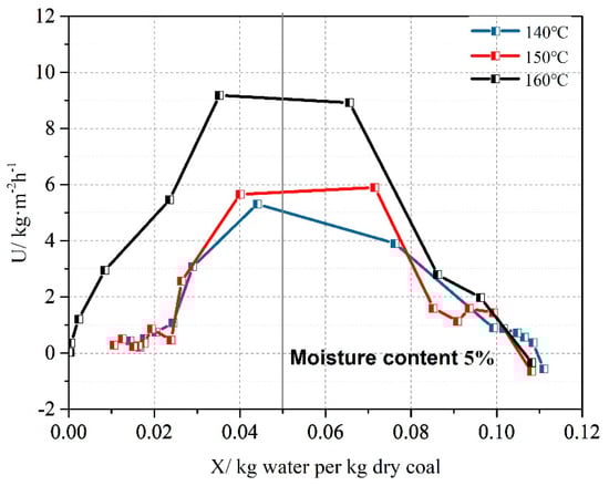 The drying rate of the surface coal can be divided into three stages: Heat-up stage, constant-rate stage and decreased-rate stage [,]. At the heat-up stage, the temperature rises, but the water content is barely changed. At the constant-rate drying stage, the drying speed is completely determined by the vaporization rate, so it is also called “surface vaporization control stage”. In the decreased-rate drying stage, the drying rate is determined by the diffusion rate of moisture inside the material, and it is also called the internal diffusion control stage [,].