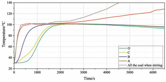 In order to explore the laws of heat and mass transfer during coal drying under static and stirring conditions, the sidewall indirect drying experiment was carried out. The device is shown in Figure 2. Wet coal (wt 12% water content) was placed in the circular tank, and a layered wire mesh circle was placed in the middle of the tank which divided the round tank into three parts by dividing the radius equally. The thickness of each layer was 2.75 cm. Four thermocouples were inserted into the coal at the locations marked at point O, A, B, and C. The distance from the heat source to thermocouples was 1.375 cm at point A, 4.125 cm at point B, 6.875 cm at point C, and 8.25 cm at point O. The coal was divided into three parts: an inner layer, middle layer and outer layer. The insertion depth of the thermocouple is half the height of the coal sample depth. The round tank was placed in a thermostatic oil bath at 150 ℃. The temperature data was recorded by each thermocouple every 2 s, starting from the time when the tank was placed in the oil bath. Samples were taken every 5 min from the three layers of the coal in the circular tank and tested for moisture, respectively. At each moment, three such samples were taken as parallel.