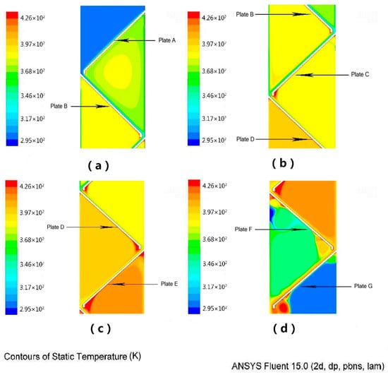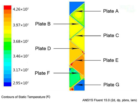 The seven inclined plates were marked as Plate A to Plate G from top to bottom. Set the temperature of the plates’ surface temperature at 160 °C (the plates heat evenly), set the space above Plate A as non-sealed, so the temperature above Plate A is almost the ambient temperature. The internal temperature cloud of the device is shown in Figure 11 and Figure 12.