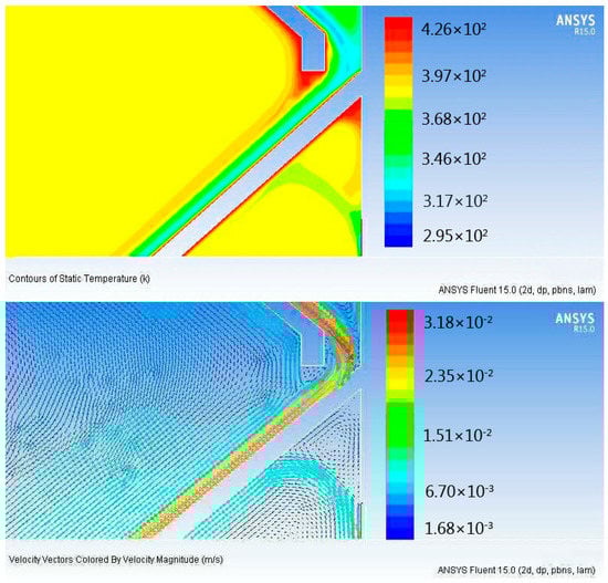 The specific status of the interface renewal of the coal descending port of each plate is further described in detail by the flow velocity field. In Figure 13, the velocity field and temperature field of the descending port from Plate B to Plate C is shown.