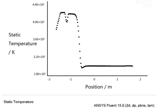As shown in Figure 14, the coal material continues to descend after leaving Plate B. When it reaches the bottom of Plate C, the total residence time of the coal in the device is about 380 s, and the temperature reaches 90 °C; when it reaches the bottom of Plate D, the total residence time is about 500 s, and the temperature reaches above 100 °C. According to the law of temperature rise in the thin-layer plane drying experiment, the water content in the coal feed has dropped below 6%. The heat transfer process then tends to be dominated by the thermal conductivity of pure coal, and the temperature of the coal feed continues to rise at a constant rate. Since the space between Plate F and Plate G is close to the coal outlet temperature, when the coal reaches Plate G, its temperature is already much higher than the space temperature, and the temperature of the coal from the bottom of Plate G is close to the heat source temperature. The curve shown in Figure 14 is the temperature distribution of the dry coal outlet section. The horizontal axis shows the horizontal coordinate of the dried coal outlet. After the coal material drops from the lower outlet of Plate G and leaves from the coal outlet, the temperature on the left side of the curve has reached 420 K, which is equivalent to 146–147 °C. It means that if there is an interface renewal, the heat transfer rate of the coal material in the residence time of 900 s is significantly improved.